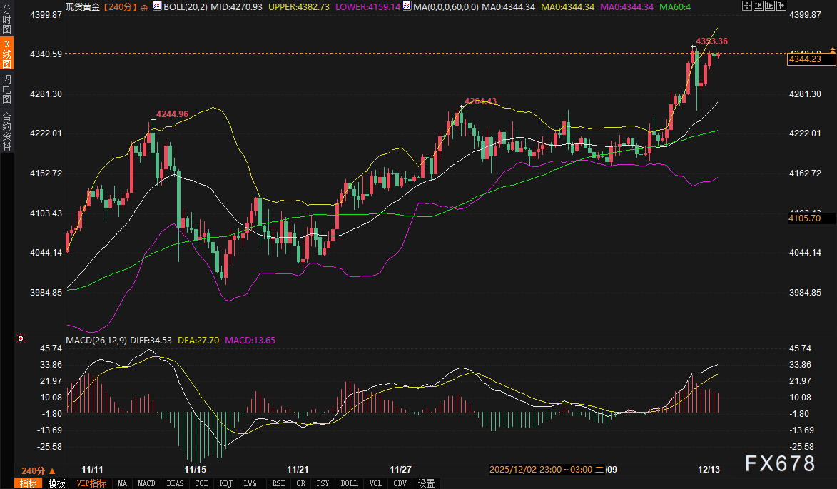 现货黄金:支撑4270美元(布林带中轨),阻力4400美元(心理关口与通道上沿)